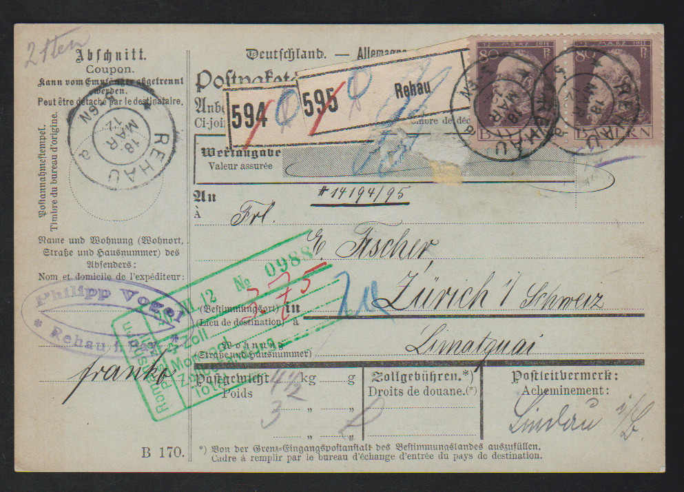 80 Pfg. Luitpold im Paar auf Auslands-Paketkarte (kl. Schürfung ausserhalb) von Rehau 1912 in die Schweiz