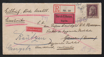 80 Pfg. Luitpold einzeln auf R-Expreßbrief von Nürnberg 1913 nach Giessen und von dort nach Bautzen nachgesandt, typische Gebrauchsspuren