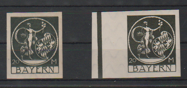 20 Mk. Bayern-Abschied, zwei geschnittene Probedrucke, schwarz postfrisch, Doppeldruck dunkelgrün ungebraucht (dieser gering fleckig)