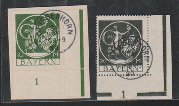 10 und 20 Mk. Bayern-Abschied, je gestempelte rechte untere Bogenecken mit Platten-Nr. "1", einmal typisch in der Zhg. vorgefaltet, einmal sign. Infla