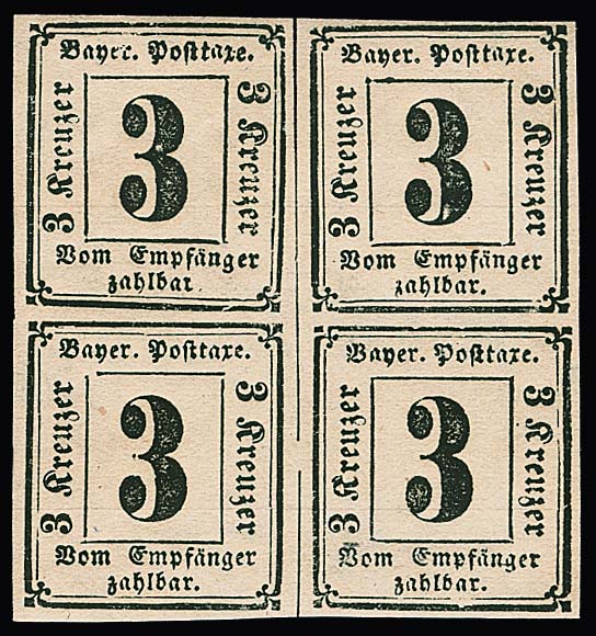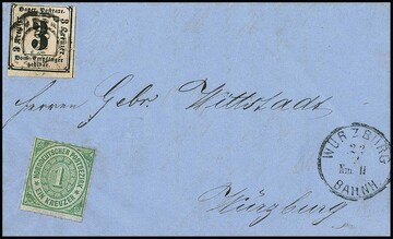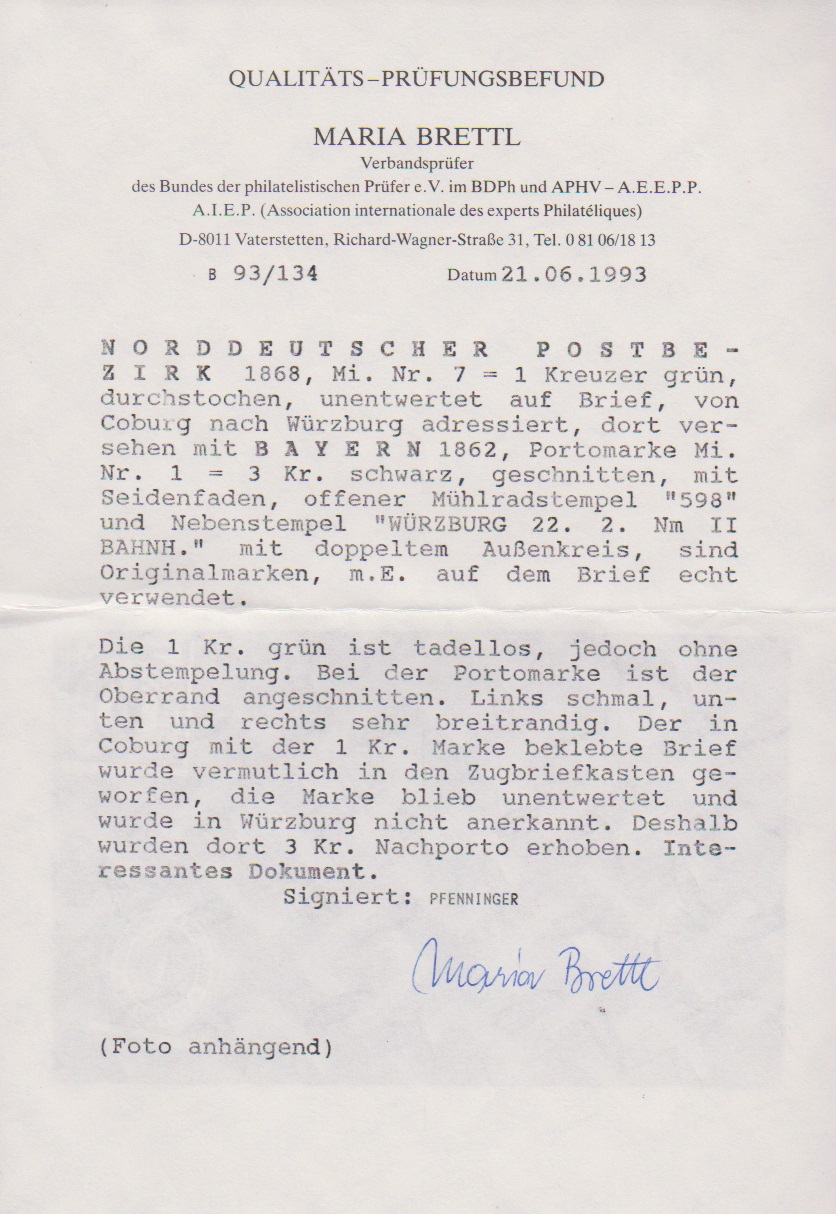 Portomarke 3 Kr. schwarz, oben berührt, auf Brief von Coburg (Inhalt) nach Würzburg, vermutlich mit der 1 Kr. NDP vorfrankiert, in den Zugbriefkasten geworfen, die NDP-Marke unentwertet und am Empfangsort in Würzburg mit der Portomarke nachfrankiert, Kuriosum. Sign. Pfenninger und Attest Brettl