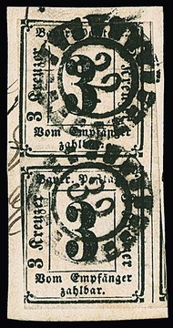 Portomarke 3 Kr. schwarz im senkrechten Paar mit zentrischem, seltenem oMR "784" (Teuschnitz). Untere Marke riesenrandig und gut, obere nur oben berührt. Sign. Schmitt und Fotoexp. Sem. Mi. 1500,- + Stempel