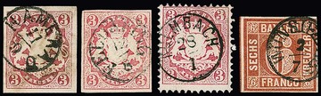 Vier Werte mit seltenen Fingerhut-K1: "Wunsiedel" auf 6 Kr. braun, Type I (hinterlegt, sign. Engel), "Hanerau" auf 3 Kr. (Seidenfaden locker, Fotoexp. Bretl), "Feldafing" (erh. sign. Schmitt) und "Kulmbach" auf Kabinettstück 3 Kr.