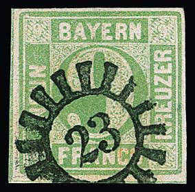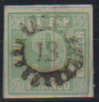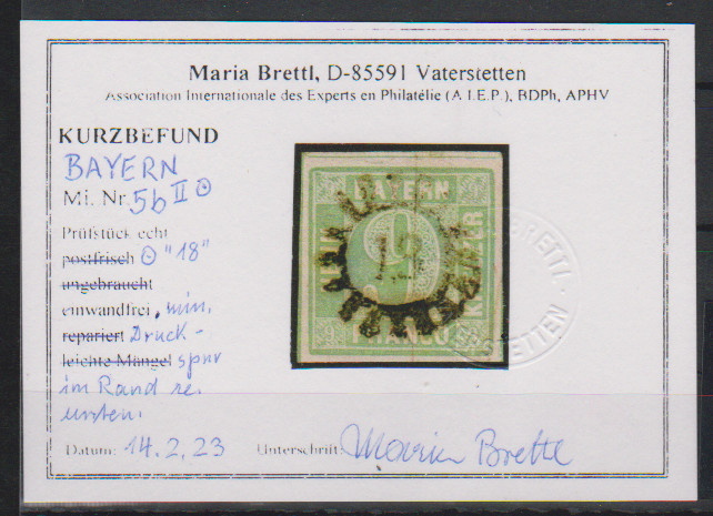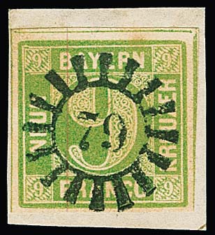 9 Kr. blaugrün, Type II, breitrandig und mit zentr. gMR "18" (Augsburg), min. Druckspur im re. unteren Rand, Fotoexp. Brettl "einwandfrei". Mi. 300,-
