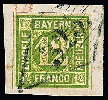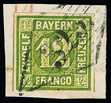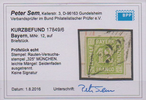 12 Kr. grün, gut gerandet (Seidenfaden entfernt) auf dekor. Briefstück mit auf diesem Wert seltenem Rauten-Versuchs-NS "325" von München, Fotoexp. Sem