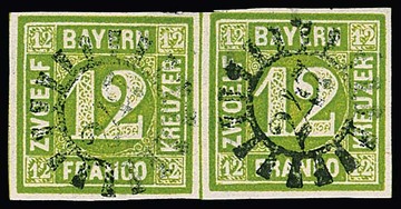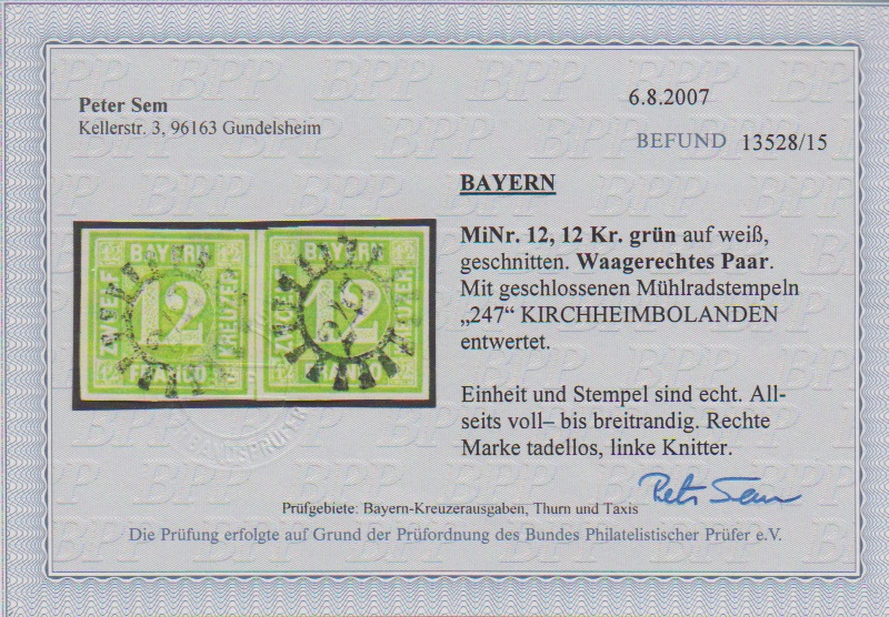 12 Kr. grün, waagerechtes prachtvolles Paar (linke Marke kl. Knitter) mit gMR "247" (Kirchheimbolanden), Fotoexp. Sem. Mi. 500,-
