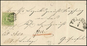 12 Kr. grün, perfektes Exemplar auf gef. Inlandsbrief (rechts fehlt ein Klappenteil) der 4. Gewichtsstufe (selten!) von Freising nach Geisenfeld