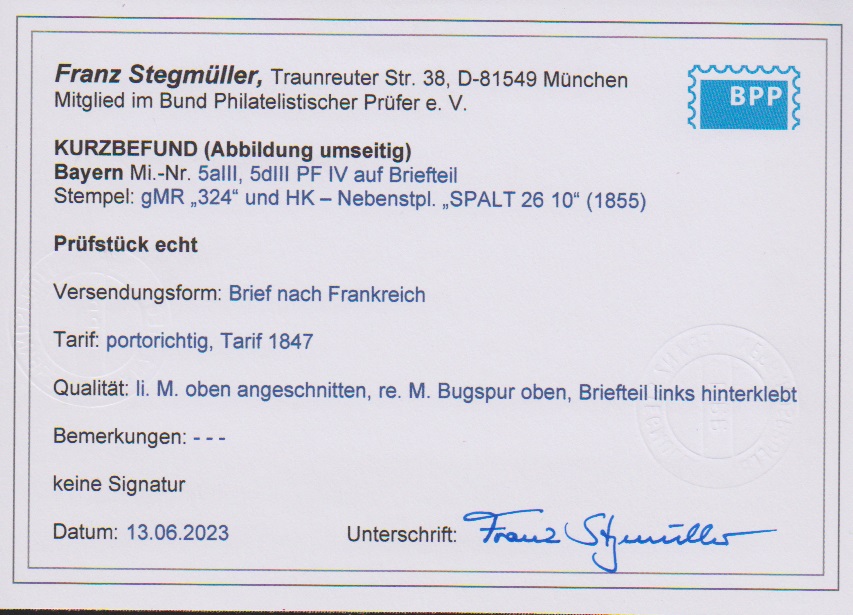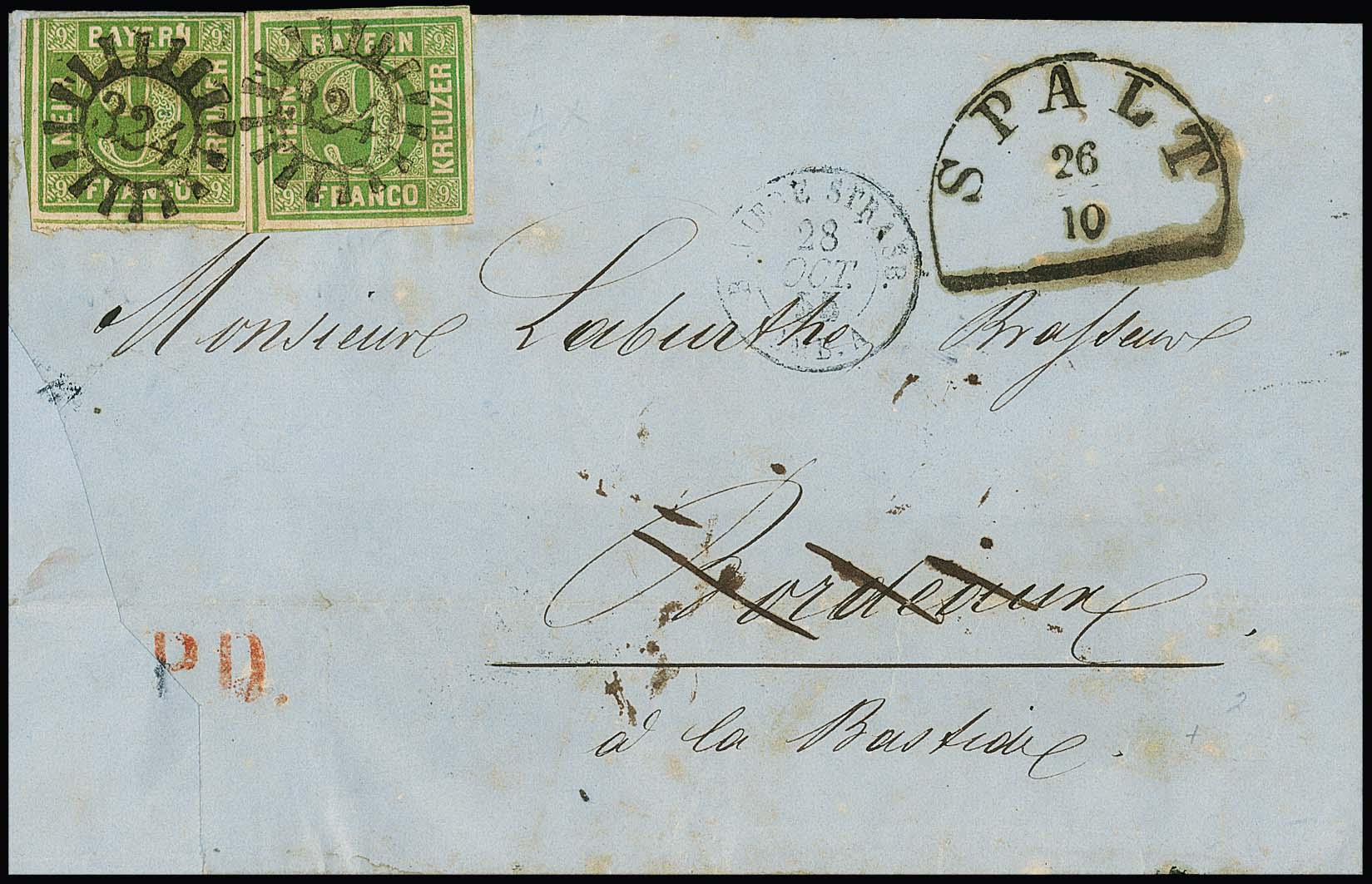 9 Kr. bläulichgrün (Bugspur) in wertgleicher Mischfrankatur mit 9 Kr. gelblichgrün (oben ber.) auf Auslandsbrief (Briefteil links Papierfehlstelle hinterlegt) mit zentr. gMR "324" und HK "Spalt`" nach Frankreich. Seltene Kombination, Fotoexp. Stegmüller