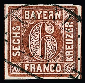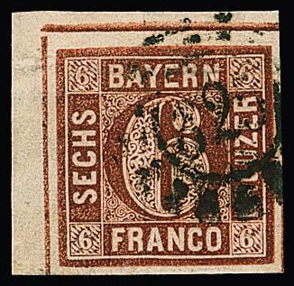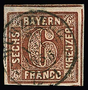 6 Kr. braun (kl. Mgl.), breitrandig, mit idealem K2 "Würzburg" v. 20.11.1856 aus der Umtauschzeit