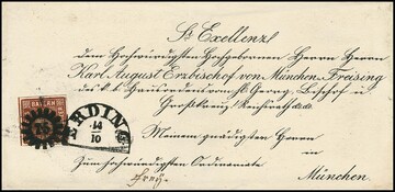 6 Kr. braun, breitrandiges Prachtstück mit kräftigem gMR "75" und typisch leicht auf die Marke übergehendem HK "Erding" auf Bischofsbrief an Erzbischof Karl August nach München 1851, Fotoexp. Sem