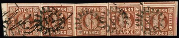 6 Kr. braun, 31 Werte (ein Paar) aus der Vergleichssammlung von W. Engel, dabei einmal zentrischer Umtausch-HK vom 25.11., Randstücke und Bogenecken etc.