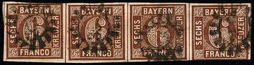 6 Kr. braun, Type II, Platte 3, waagerechter gestempelter Viererstreifen, die beiden Aussenmarken einseitig gering berührt und Seidenfaden teils gelockert, Mi. 3500,-