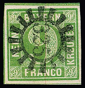 9 Kr. bläulich- und blaugrün, drei gestempelte Kabinettstücke, je sign. Brettl. Mi. 290,-