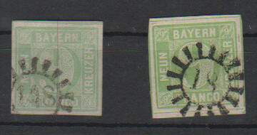 9 Kr. bläulichgrün, Typen II und III, zwei Kabinettstücke, sign. Sem bzw. Brettl. Mi. 150,-