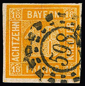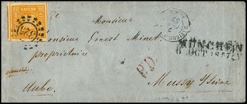 18 Kr. orange, allseits überrandiges Kabinettstück mit Teilen von Nebenmarken an zwei Seiten bzw. vollen Schnittlinien, als Einzelfrankatur auf gefaltetem Damencouvert von München 1857 nach Mussy s./Seine (Frankreich). In dieser Schnittqualität ungewöhnlich! Attest Brettl. Mi. 1500,-