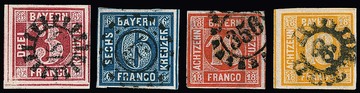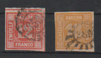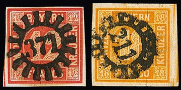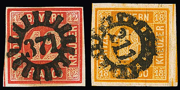 12 Kr. rot (kleine rechte obere Bogenecke, sign. Bühler), sowie 18 Kr. orange (sign. Stegmüller), je tadellos gestempelt. Mi. 420,-