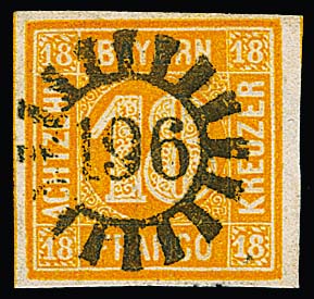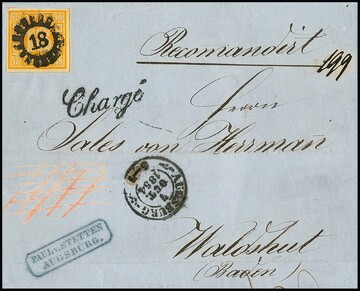 18 Kr. orange, breitrandiges Kabinettstück mit zentrischem gMR "18" auf gefaltetem Einschreibebrief von Augsburg 1854 nach Waldshut. Unten ist der Seidenfaden gering locker, was m.E. belanglos ist (tadellos sign. Schmitt). Attest Sem. Ein dekorativer Recobrief der 2. Gewichtsstufe!
