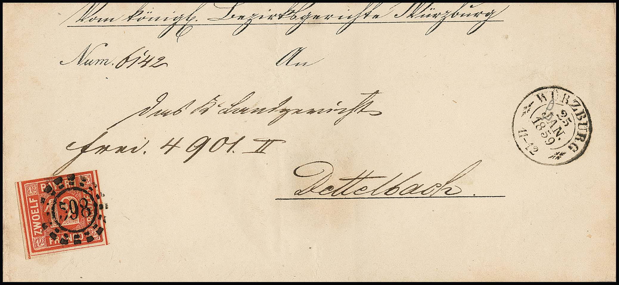 12 Kr. rot (oben gering berührt) einzeln auf Inlandsbrief der 4. Gewichtsstufe von Würzburg 1859 nach Dettelbach (Entfernung 19km)