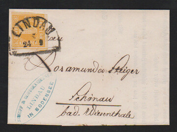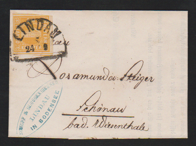 1 Kr. gelborange auf kleiner Kabinett-Drucksache mit klarem HK "Lindau" nach Schönau/Baden