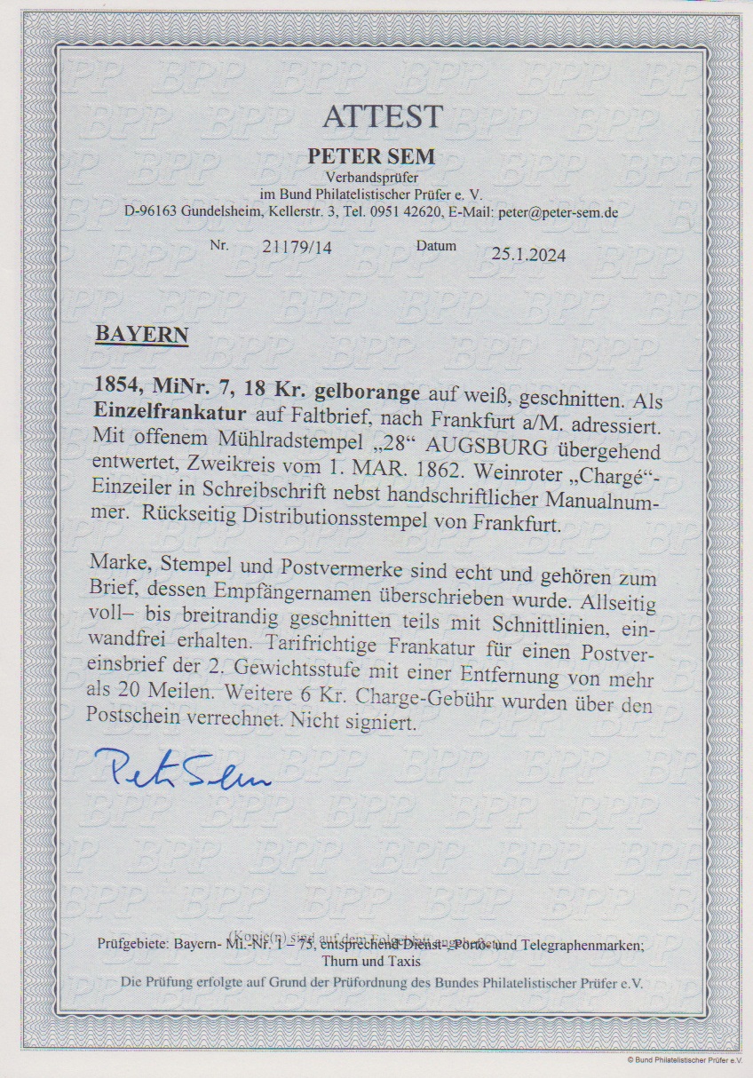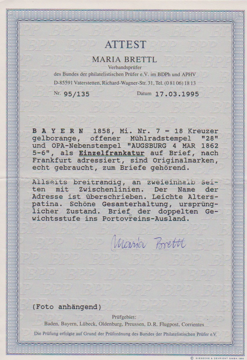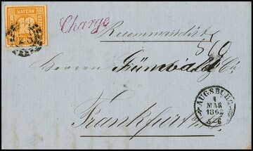 18 Kr. gelborange einzeln auf eingeschriebenem Prachtbrief der 2. Gewichtsstufe von Augsburg (oMR "28" und K2 1862) nach Frankfurt. Im Brief Adreßname überschrieben (belanglos), Atteste Brettl und Sem. Mi. 1500,-