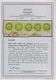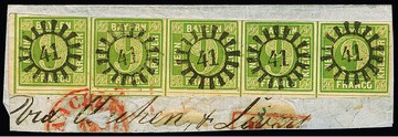 9 Kr. gelbgrün, farbfrischer, waagerechter Fünferstreifen, voll- bis breitrandig auf Briefstück (links zwei Marken kl. Knitterung), idealer gMR "41" (Burgkundstadt) sowie roter Transitstempel von Aachen. Ein attraktiver Streifen, wobei interessanterweise alle fünf Marken die Type III zeigen, Fotoattest Sem