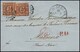 18 Kr. orange im waagerechten Paar, linke Marke links berührt und kleiner Eckknitter, rechte breitrandig, mit klaren gMR "291" und großen Teilen von zwei roten Transitstempeln. Mi. 1200,-