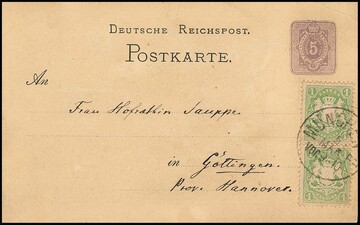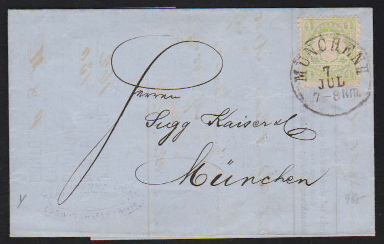 1 Kr. grün, senkrechtes Prachtpaar, dieses in kurioser Verwendung auf Deutsches Reich Ganzsachenkarte 5 Pfg. purpur (kl. Randriß), mit K1 "München" aus März 1875 nach Göttingen