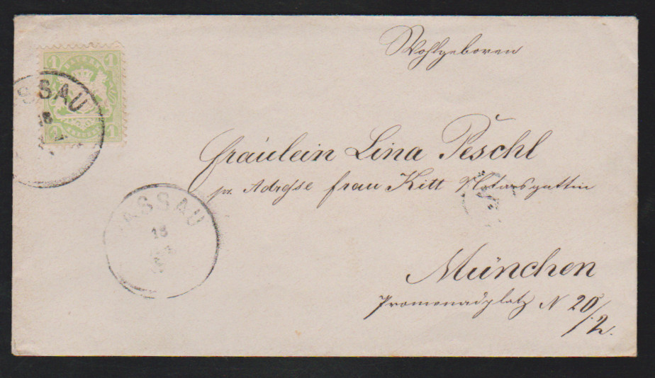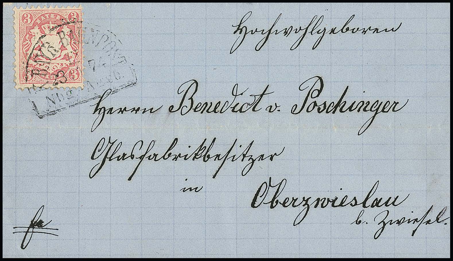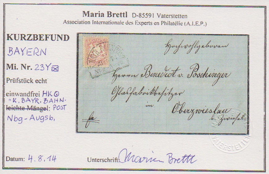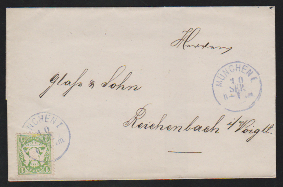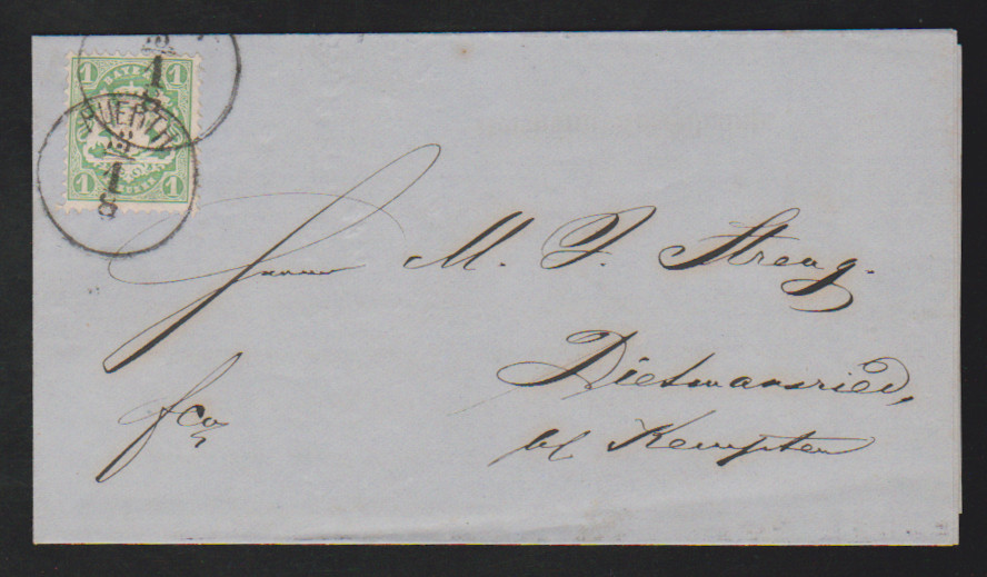 1 Kr. bläulichgrün einzeln auf Pracht-Vertreter-Drucksache aus Fürth, sign. Sem. Mi. 180,-