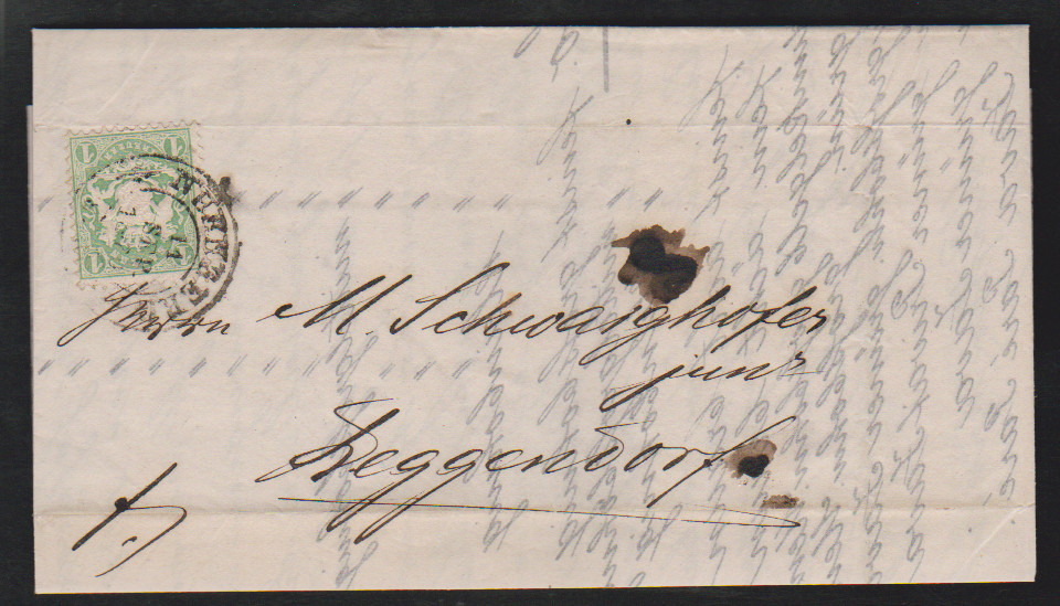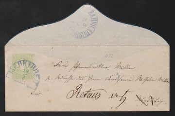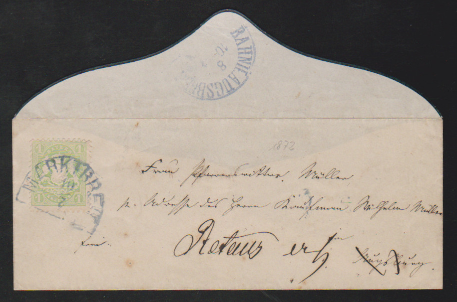 1 Kr. grün, perfektes Exemplar auf schwarz gerandetem Retour-Trauer-Couvert mit blauem HK "Marktbreit"