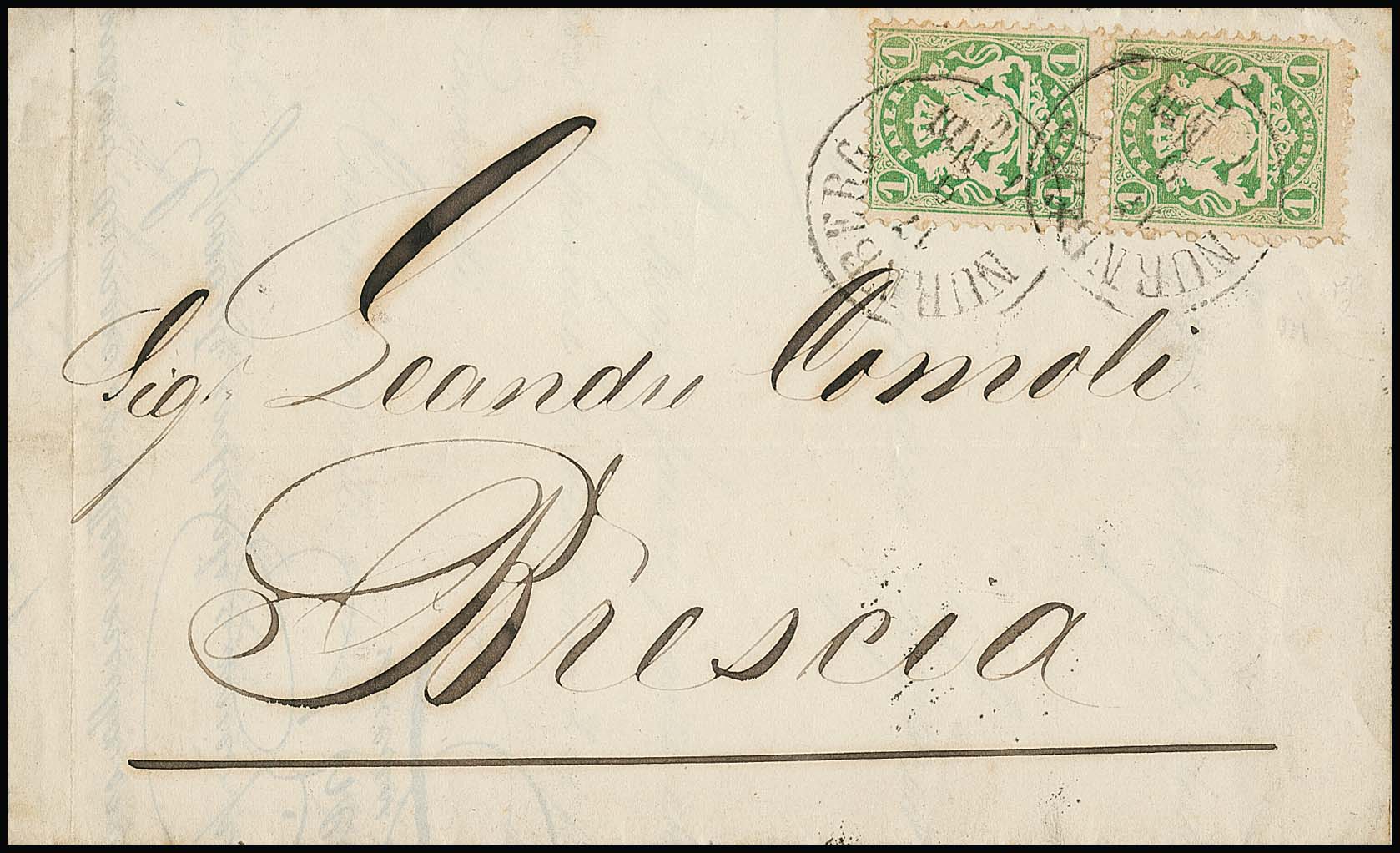 1 Kr. gelbgrün im Paar auf Kabinett-Auslands-Drucksache von Nürnberg 1874 nach Brescia/Italien, Fotoexp. Sem