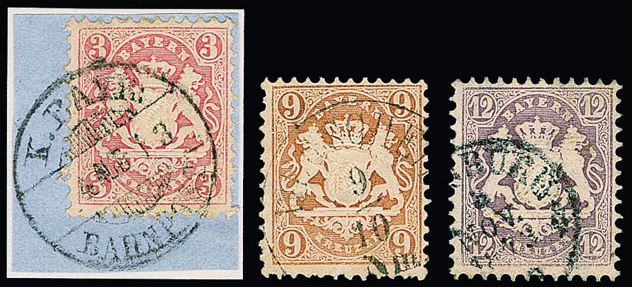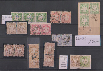 Wappen Kreuzer, gestempelte Zusammenstellung mit Dreierstreifen, Paaren (u.a. 6, 7, 18, zweimal 9 und 10 Kr.), Kabinettbriefstück mit 1 und 6 Kr. (Nr. 22Xa u. 24X, sign. Schmitt) usw.