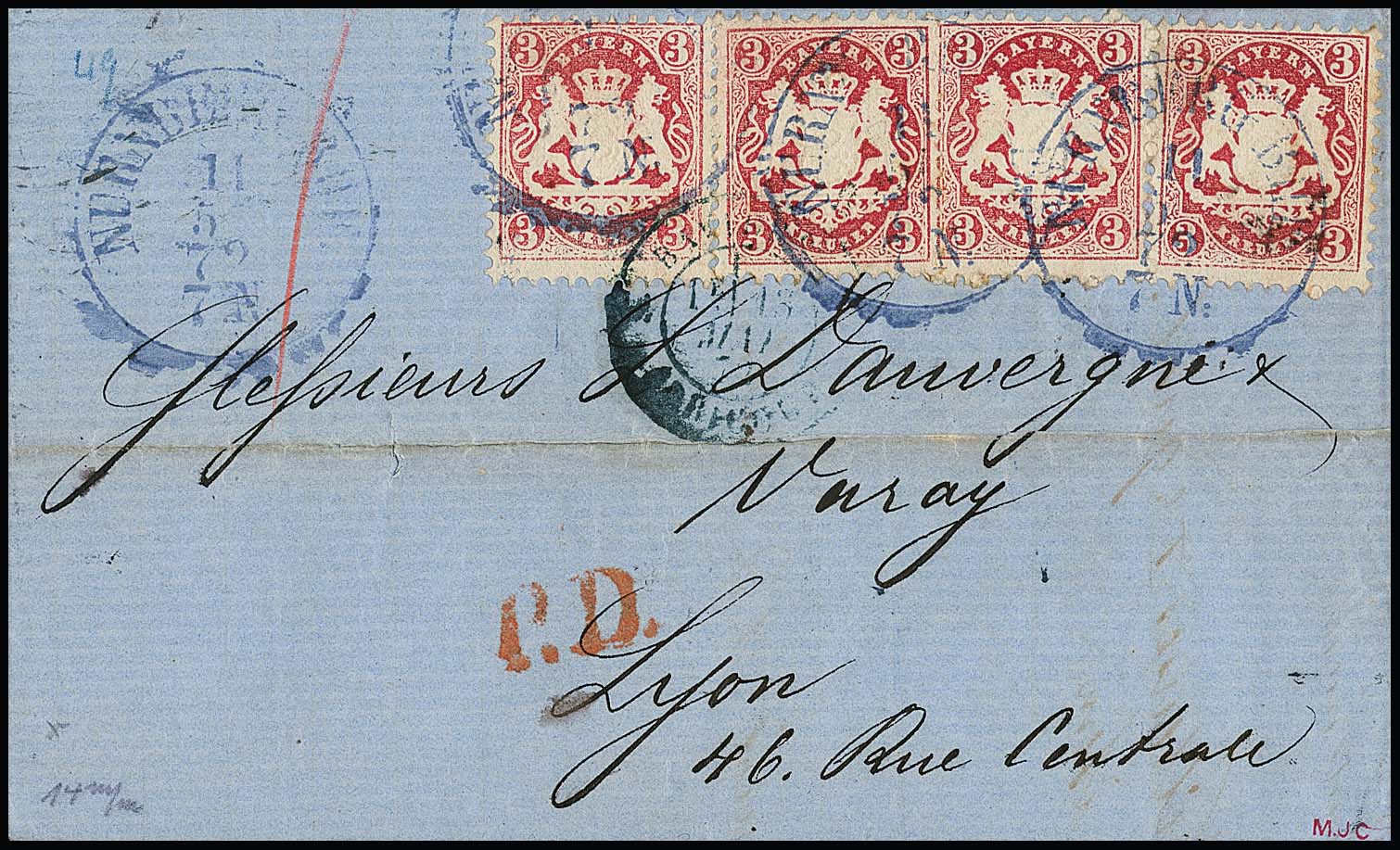 3 Kr. rosa, vier Prachtstücke auf Auslandsbrief (Mittelfalte ausserhalb etwas getönt) von München 1872 nach Lyon