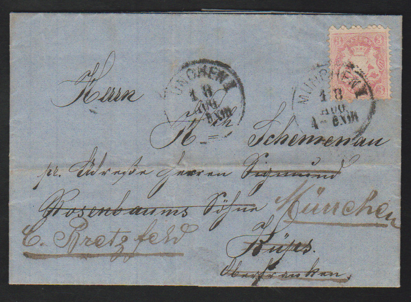 3 Kr. rosa, Prachtstück auf gef. Retourbrief von München nach Küps, Bretzfeld und retour