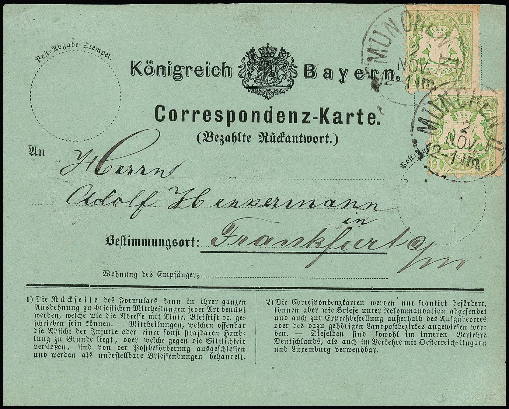 1 Kr. hellgrün per zwei (einmal min. Eckzahnbug) auf grüner Rückantwort-Correspondenzkarte (rs. Haftspur) mit K1 "München"