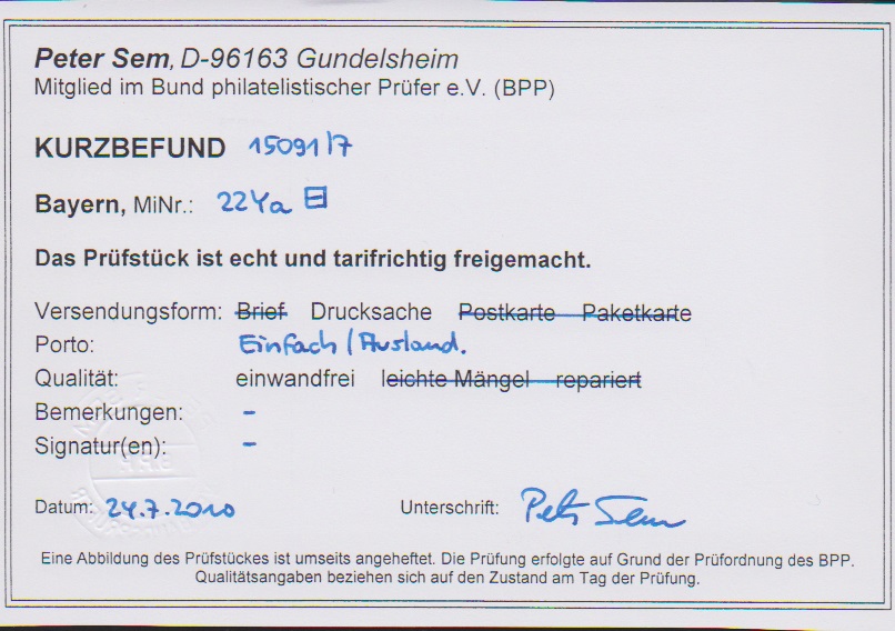 1 Kr. hell-, dunkel- und bläulichgrün, Wz. enge Rauten, sowie Nr. 22Ya, gesamt vier tadellose Einzelfrankaturen, sign. Sem, Stegmüller u.a. Mi. 325,-