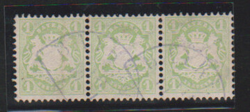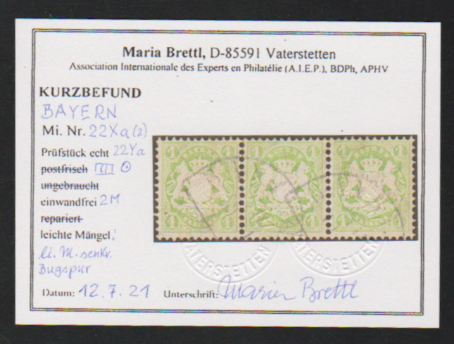 1 Kr. grün im gestempelten waagerechten Dreierstreifen (li. Marke Bugspur) mit Misch-Wasserzeichen, zweimal X, einmal Y, Fotoexp. Brettl