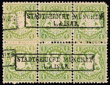 1 Kr. hellgrün im Sechserblock (das rechte senkrechte Paar stark angetrennt und nur noch an zwei Zähnen zusammenhängend, re. obere Marke "eckrund") mit Ra2 "Stadtgericht München l.d. Isar". Mittlere untere Marke deutlicher Plattenfehler "Randlinie links unten mehrfach eingedellt"