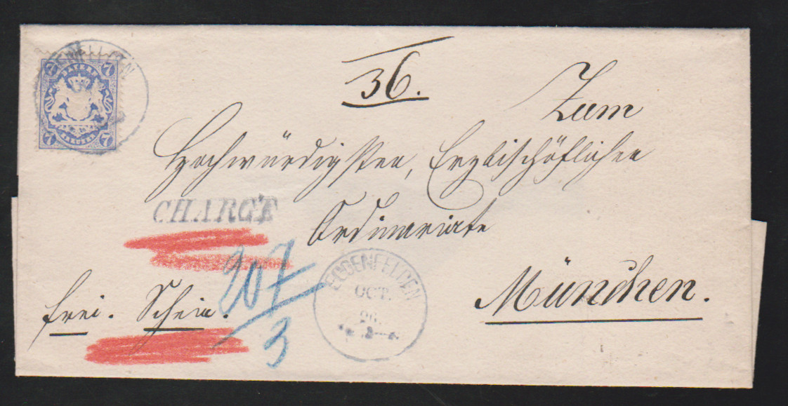 7 Kr. blau auf dekor. Kabinett-Chargébrief mit blauem K1 "Eggenfelden" nach München