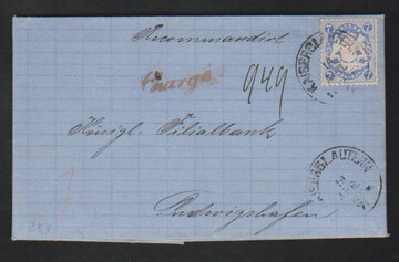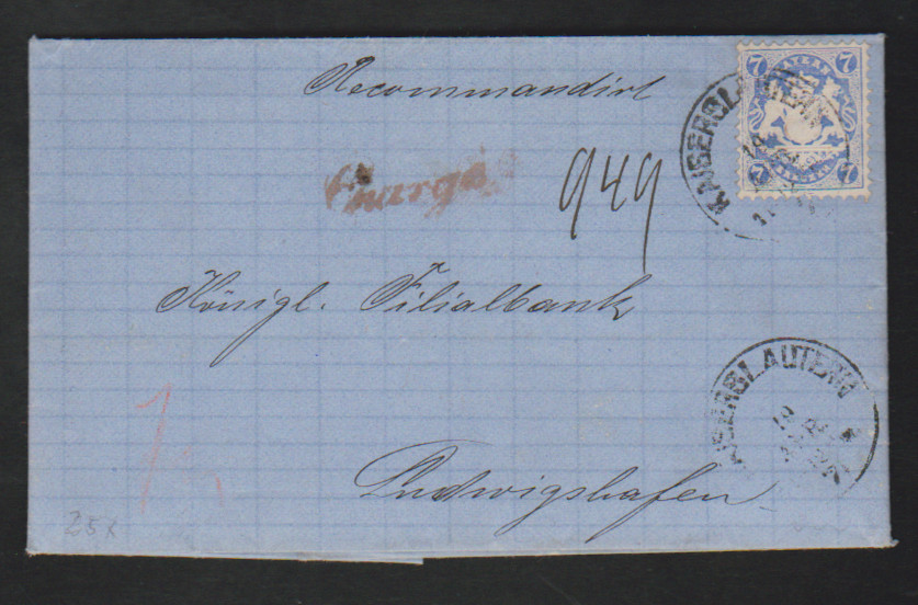 7 Kr. blau auf Kabinett-Chargébrief 1871 mit K1 "Kaiserslautern" nach Ludwigshafen
