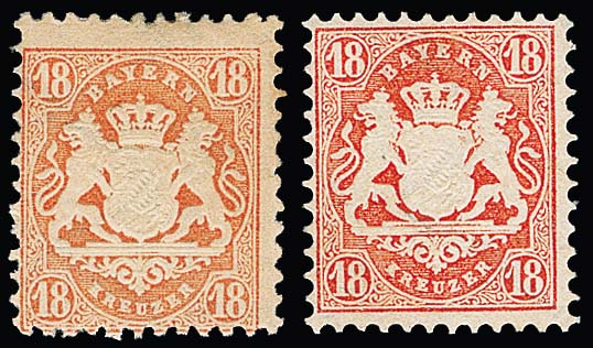 18 Kr. matt- und dunkelziegelrot, je gutes X-Wasserzeichen, zwei ungebrauchte Pracht-/Kabinettstücke, seltene Marken, Fotoexp. Stegmüller bzw. sign. Pfenninger. Mi. 880,-