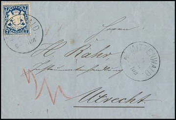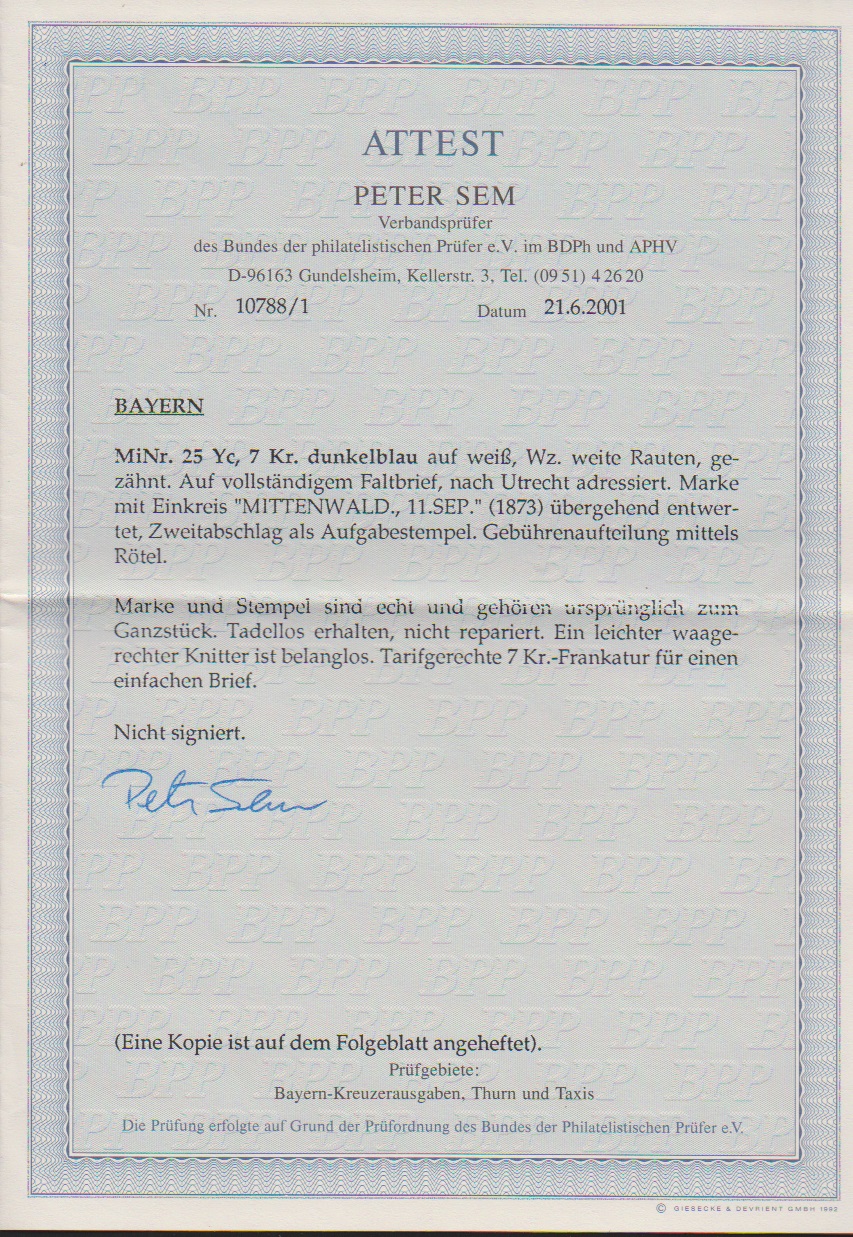 7 Kr. dunkelblau einzeln auf gef. Prachtbrief von Mittenwald (K1) nach Utrecht/Holland, Attest Sem. Mi. 900,-
