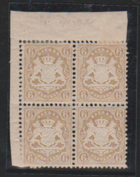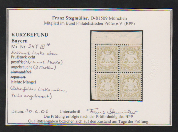 6 Kr. ockerbraun im etwas angetrennten Viererblock aus der linken oberen Bogenecke, li. untere Marke Zahnfehler, die drei anderen tadellos, davon eine postfrisch, Fotoexp. Stegmüller