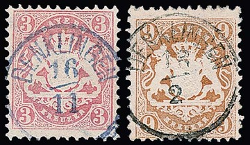 3 Kr. rosa sowie 9 Kr. braunorange, zwei Kabinettstücke mit seltenem K1 "Denklingen" in blau (Sem unbekannt) bzw. schwarz je zentrisch, beide Fotoexp. Sem