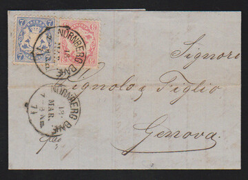 3 Kr. rosa und 7 Kr. blau, gutes Wz., auf gef. Prachtbrief von Nürnberg 1871 nach Genua, sign. Sem
