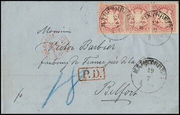 3 Kr. rosa per drei auf Prachtbrief 1875 mit K1 "Marktbreit" nach Belfort/Frankreich