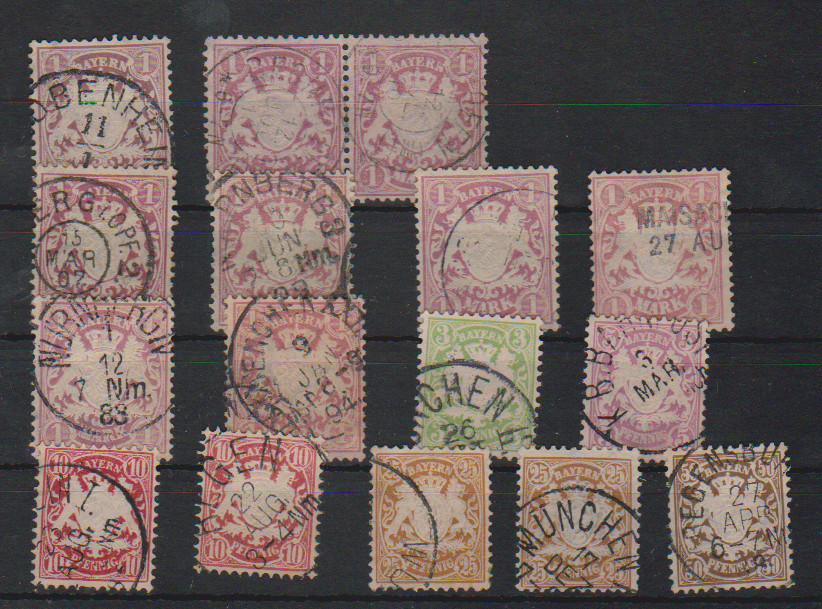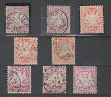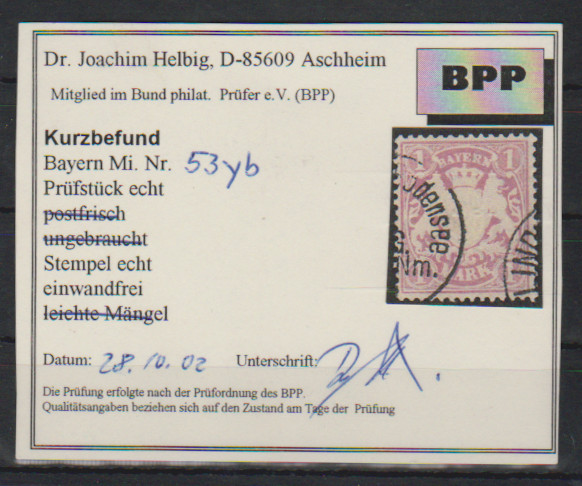 1 Mk. purpur und 2 Mk. orange, Besonderheiten der Mark-Werte, Zusammenstellung inkl. Nr. 43, 43I, 44b (ungebr.), 44a/b mit Zeitungs- bzw. Dienstsiegelstpl., 53yb und xb je gepr., sowie Nr. 53 mit Dienstsiegel. Mi. 760,- + Stempel