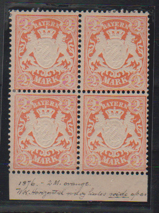 2 Mk. orange, frischer ungebrauchter Kabinett-Unterrand-Viererblock, Mi. 180,-