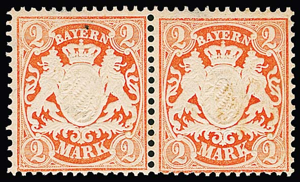 2 Mk. orange im postfrischen Paar, rechte Marke (leichte Gummitönung im Bereich der Prägung) mit Plattenfehler "Strich am K von MARK"