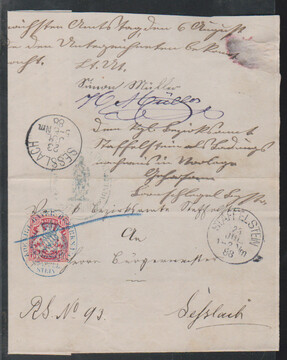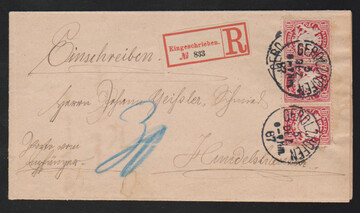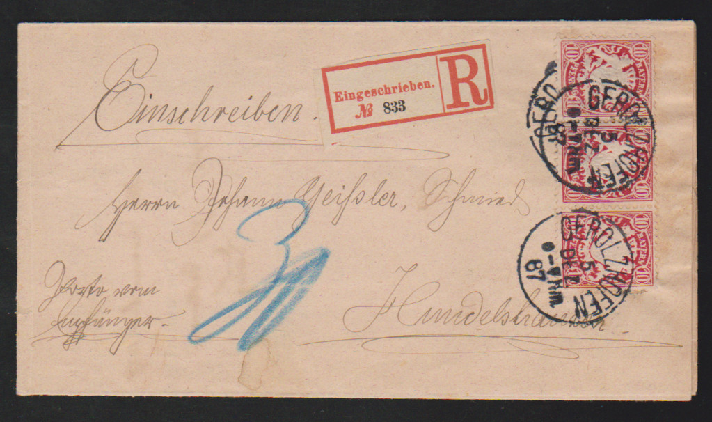 Doppelt verwendeter Gerichtsvollzieherbrief 1887: erst mit 3 Pfg. grün im Ortsbereich von Gerolzhofen und von dort mit Dreierstreifen 10 Pfg. als R-Brief weiter