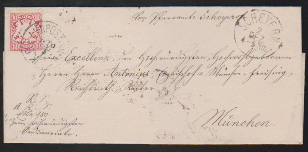 10 Pfg. rot (kl. Zf.) auf Bischofsbrief von Scheyern (Neben-K1) nach München, die Marke jedoch kurios mit Bahnpoststempel entwertet